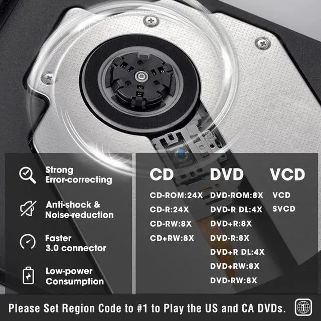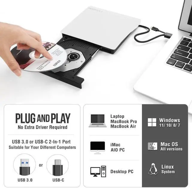 [(What You Can Do with It)] This is not just a DVD and CD ROM for Mac/PC but also a burner (writer) and ripper. You can use it to read movies DVDs/ music CDs, burn music, photos, videos, and files onto blank CDs or DVDs, import music, video, photos, and data from discs to your computer, install software, system, games, and everything else related to CD/DVD. It supports the reading and writing of various types of disks, including CD