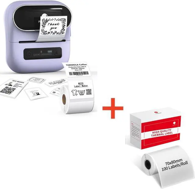 Phomemo M220 Label Maker Purple & 1 Roll Transparent Thermal Label 2.76" x 3.15"(70x80mm), Upgrade 3 Inch Barcode Portable Printer, for Office & Small Business, Compatible with Phones&PC