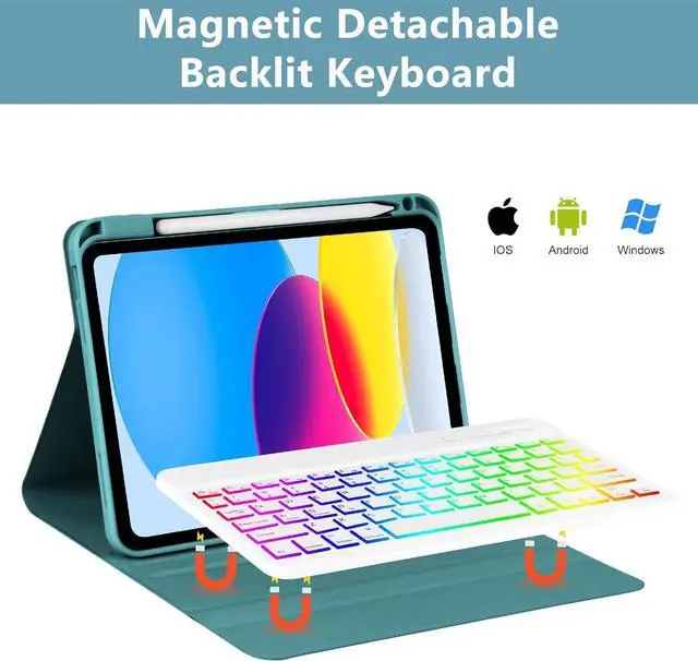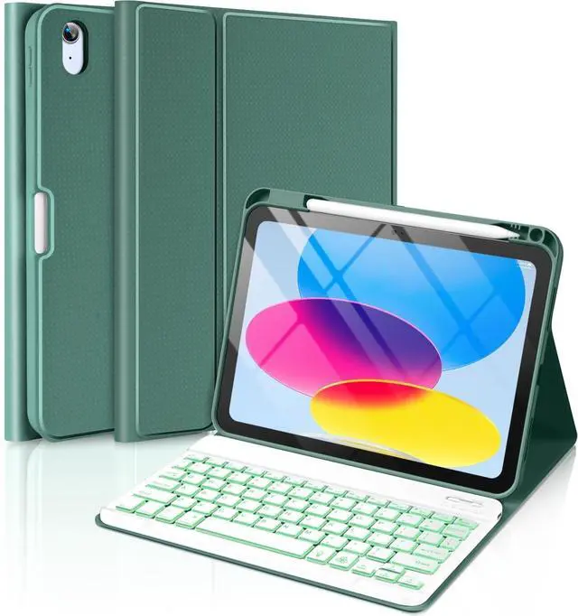 aMZCaSE for iPad 10th Generation Case with Keyboard 10.9 Inch, 7 Colors Backlight iPad 10th Generation Keyboard, Detachable Folio Keyboard Cove with Pencil Holder for New iPad 10th Gen, Camellia Green