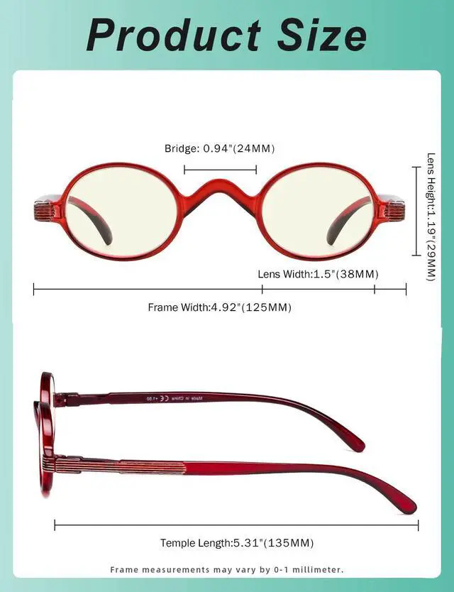 PRODUCTS DIMENSION - Frame material is Plastic,Lens width about 1 1/2 inches(38mm),Frame width about 4 15/16 inches(125mm),Lens height about 1 1/8 inches(29mm),Frame height about 1 5/16 inches (33mm),Bridge(DBL) about 15/16 inches(24mm),Temple length about 5 5/16 inches(135mm),with spring hinge