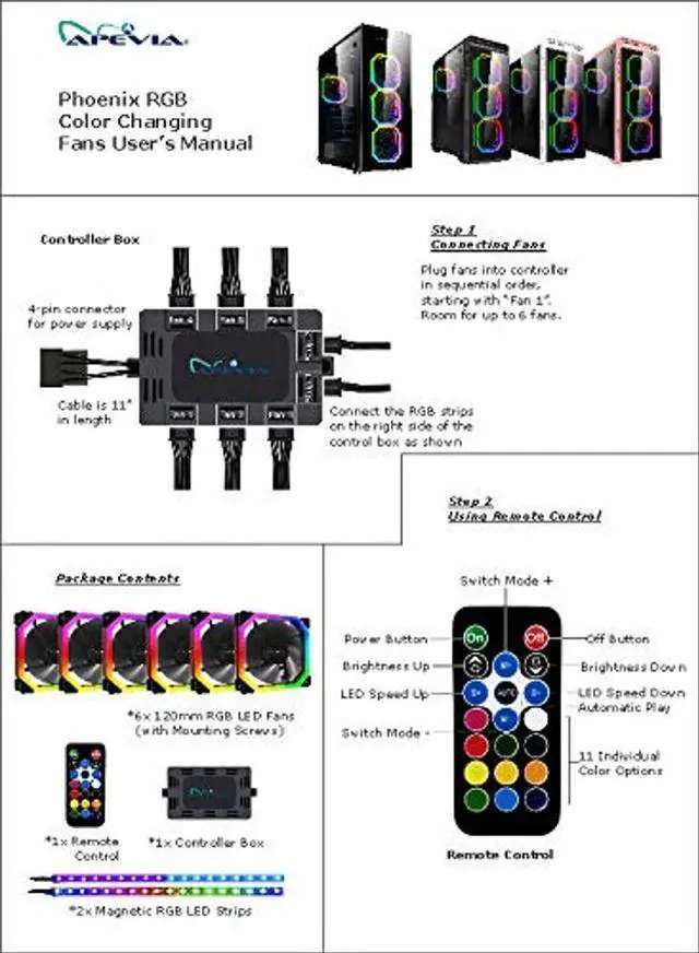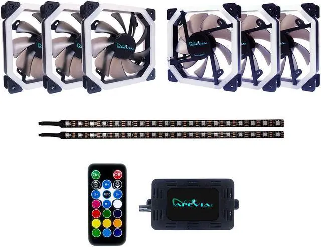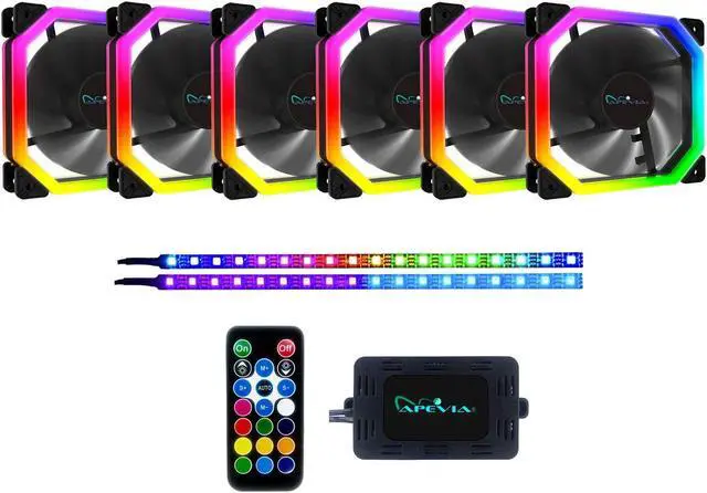 Apevia PN6P2-RGB Phoenix 120mm Silent Dual-Ring RGB Color Changing LED Fan with Remote Control, 16x LEDs & 8X Anti-Vibration Rubber Pads w/ 2 Magnetic LED Strips (6+2-pk)