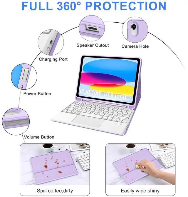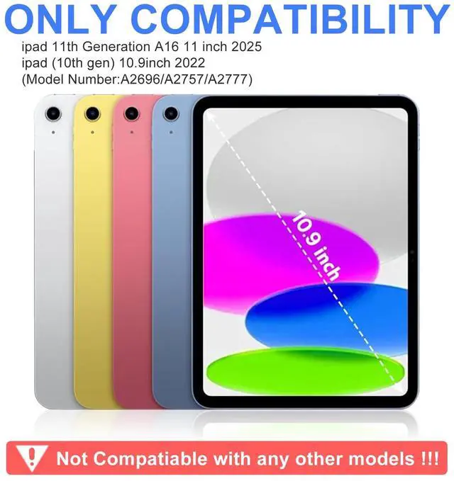 Compatibility for iPad 10th - This for iPad 10th generation keyboard case is ONLY compatible with iPad 11th Generation A16 11 inch 2025, iPad 10th gen 10.9 inch 2022 (Model Number:A2696/A2757/A2777). Not for any other models. Please check the model number No. "AXXXX" the bottom of the back of your tablet to confirm correct size before purchasing.