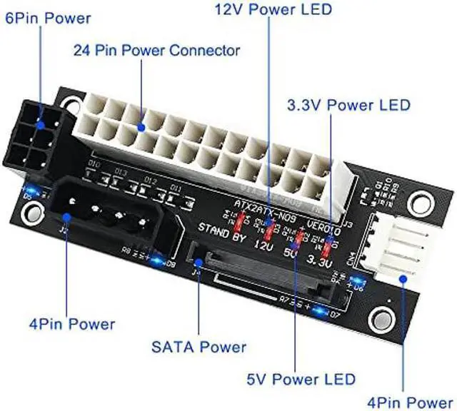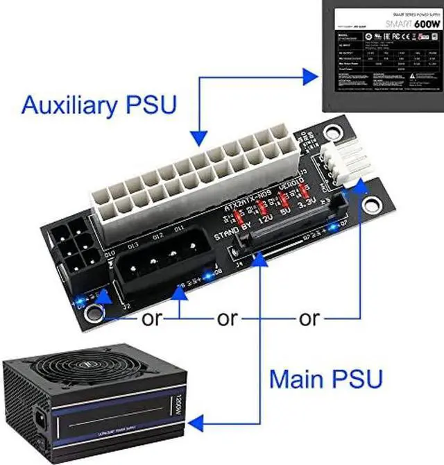 Dual Psu Adapter ADD2PSU Power Supply Connector 4 in 1 Molex 4Pin/SATA/ATX 6Pin/4Pin Dual PSU Multiple Power Supply Adapter, Synchronous Power Board, Add 2PSU with Power LED Product Description 1. The new version computer psu connector adds the 3.3V /5V/12V /PS-ON/Standby power LED, It can directly show the PSU work status. 2. Use this power adapter Atx Psu Connectors to turn on and off the two power supplies with low power at the same time, thereby increasing the power of the power supply. 3. you can connect molex 4Pin/SATA/ATX 6Pin/4Pin cable any one from the main PSU to this power adapter, and the secondary power supply's 24PIN Male is connected with the PSU's 24Pin female.