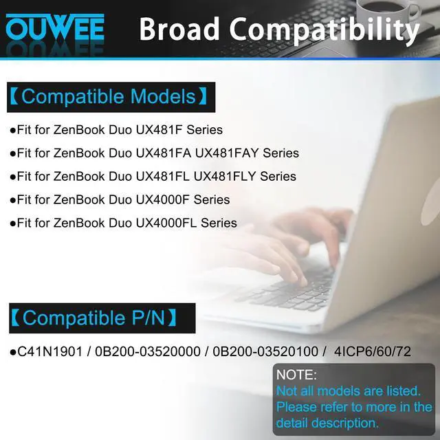 Fully compatible and high stabilityFit for ASUS ZenBook Duo UX481F UX481FA UX481FAY UX481FA-BM020R UX481FA-BM018R UX481FA-BM021R UX481FA-BM025R UX481FA-BM011T UX481FA-BM018T UX481FA-BM020T UX481FA-DB71T Series; Replacement for ZenBook Duo UX481FL-BM002T UX481FL-BP1505T UX481FL-BM044T UX481FL-BM020R UX481FL-BM040T UX481FL-BM050T UX481FL-BM021R UX481FL-BM020T UX481FL-B7611T UX481FL-BM021TS UX481FL-BM039R Series; Replacement for ZenBook Duo UX4000F UX4000FL Series.