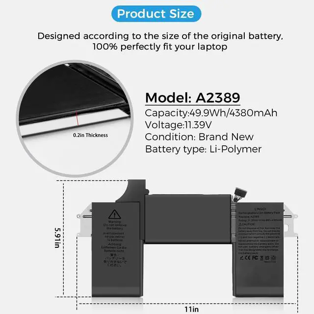 Specification of the BatteryBattery Model:A2389.Capacity: 4380mAh/49.9Wh, Voltage: 11.39V. Battery Type: Li-Polymer;100% brand new from manufacture