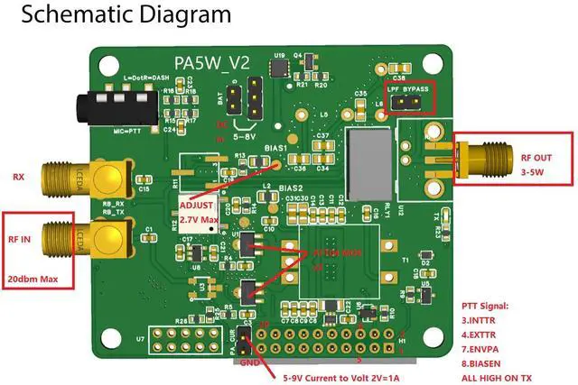 New Version V2: The output power of the amplifier board V2 is slightly higher than that of the previous version, with V2 reaching 35W. Technical Specs: Power in 6-8V (8.4V preferred); HF Power in: Tx from radioberry; HF Power out: 3-5W for for HF amplification. RF range: 1mhz-50mhz. Port Type: Input SMA, Output SMA. Supports SSB, FM, and AM