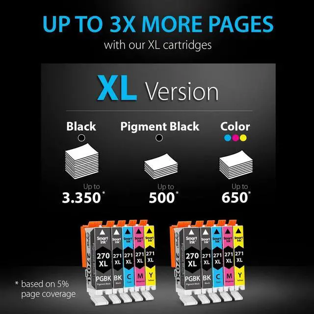 Package Contents: 2 x Pigment Black 270XL, 2 x Black 271XL, 2 x Cyan 271XL, 2 x Magenta 271XL, 2 x Yellow 271XL (10 high-yield cartridges in total)