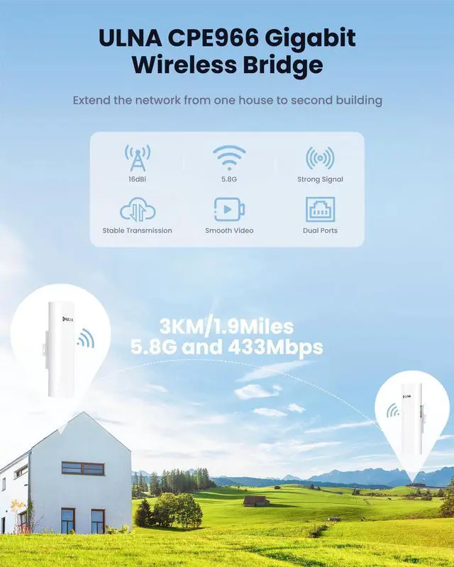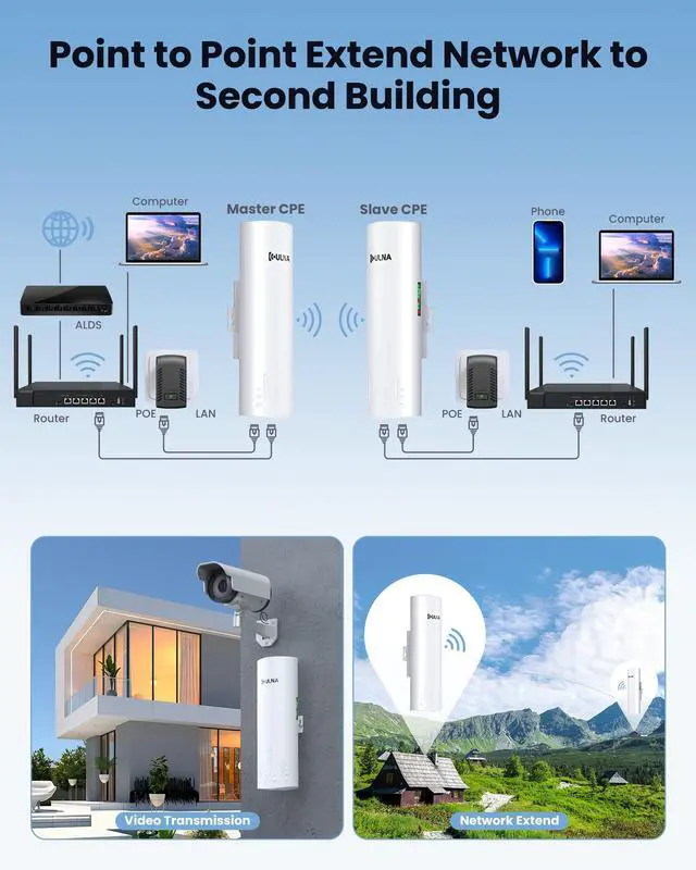 ULNA Point to Point Wireless Bridge: 5.8GH z 1Gbps High-Speed Point-to-Point Starlink WiFi Extender - 3km Range, 16dBi Antenna, IP65 Waterproof, Plug & Play, Ideal for Barn, Garage, Shop