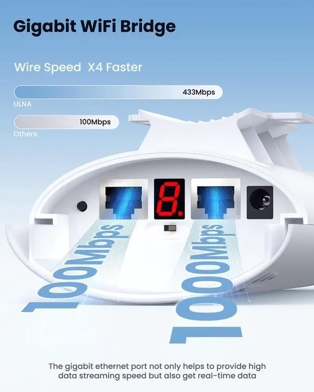 High-Speed Transmission: Gigabit RJ45 port and a 100Mbps RJ45 port. It delivers up to 1200Mbps transmission between units, with the Gigabit RJ45 port providing a maximum wired network speed of 433Mbps