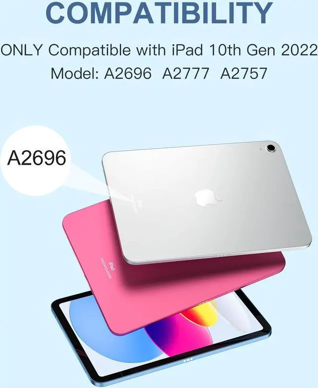 [(Compatibility)] This for iPad 10th generation keyboard case is ONLY compatible with iPad (10th gen) 10.9 inch 2022 (Model Number:A2696/A2757/A2777). Not for any other models. Please check the model number No. "AXXXX" the bottom of the back of your tablet to confirm correct size before purchasing