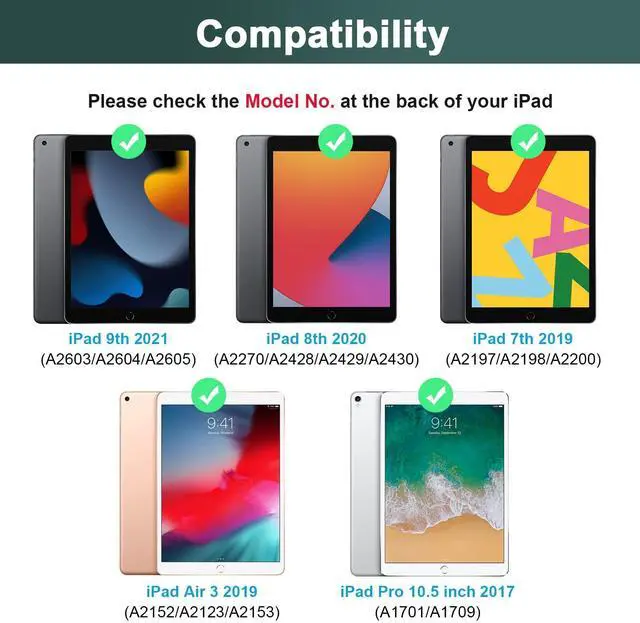Compatibility:The case is designed for iPad 10.2&10.5 inch, which is compatible with the latest iPad 9th 2021 (A2603/A2604/A2605),2020 iPad 8th genneration (A2270/A2428/A2429/A2430) / iPad 7th generation 10.2 inch 2019 (A2197/A2198/A2200), iPad Air 3 2019 (A2152/A2123/A2153), iPad Pro 10.5 inch 2017 (A1701/A1709). Not compatible with any other iPad models. Reminds: Please check the "Axxxx" logo on the back of the iPad before purchasing.