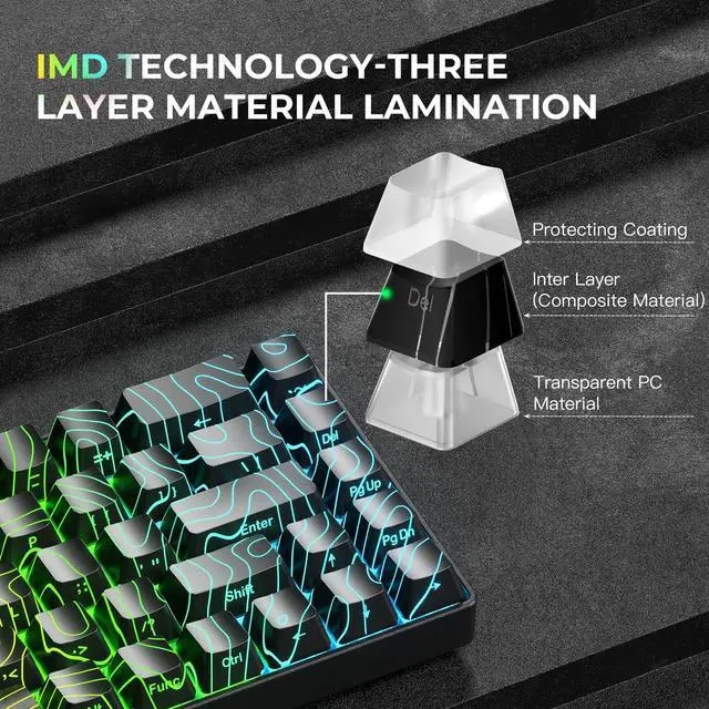 Unique Backlit Keycaps, This unique keycap features side-printed legends and topographic lines that are both backlit, giving it a premium and glow appearance. Utilizing the latest IMD technology, it ensures illumination for both legends and patterns, while also enhancing durability and maintaining a fresh look over time. ^^ IMD Keyboard Keycaps, the IMD (In-Mold Decoration) technology employs a three-layer material structure. the topographic lines and legends are embedded in the middle layer, while the outermost layer acts as a protective shield. this ensures that the legends and topographic lines remain intact and durable, eliminating any concerns about wear or fading.