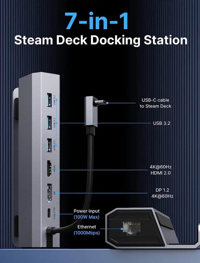 7-in-1 Docking StationEquipped with an HDMI 4K@60Hz output, a 4K@60Hz DisplayPort output, Gigabit Ethernet input, three USB-A 3.2 ports and a USB-C port for charging, letting you explore a new way to play with Steam Deck (OLED 2023) and ROG Ally. NOTENot compatible with AYANEO Game Console. The ROG Ally 30W Turbo Mode is perfectly supported with 100W power charger.