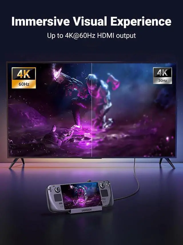 4K@60Hz HDMI Enjoy Big Screen Gaming: UGREEN Steam Deck Dock is equipped with a 4K@60Hz HDMI port and supports 2K@144Hz and 1080P@240Hz, not supports 2K240Hz. It can meet your needs to connect most resolution and refresh rate monitors to Steam Deck and enjoy a high-quality smoother visual experience. Sharing the Steam Deck game with friends and family.