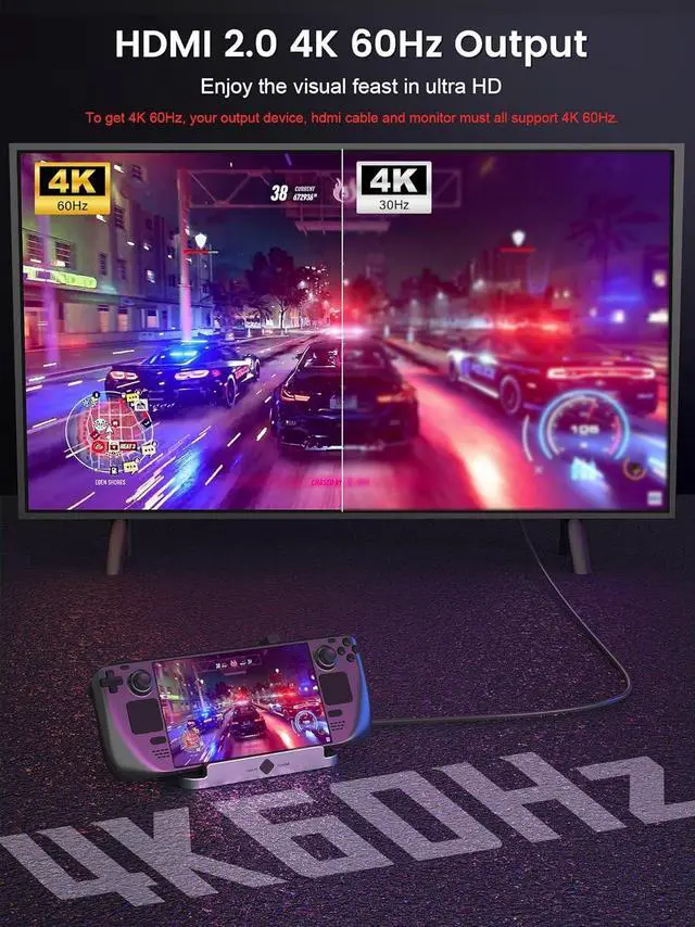 Steam Deck: This 6 IN 1 Dock Docking is for Steam Deck, comes with an HDMI 2.0 4K@60Hz output, a Gigabit Ethernet input, 3 USB 3.0 5Gbps high speed data ports and a 100W PD USB-C full speed charging port. 6 IN 1 steam deck docking station combines the hub and stand together perfectly, keep desktop neat and organized.
