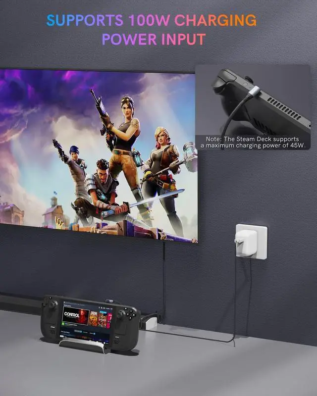 FAST CHARGING SPEED: With support for up to 100W charging, this docking stand ensures your Steam Deck is charged at full speed when paired with the original charger. Keep in mind that the maximum charging speed of Steam Deck is 45W. The dock is portable and lightweight, providing a perfect combination of hub and stand features. You don't need to purchase a separate hub and stand, making it easier for you to use and keeping your desktop neat and organized.