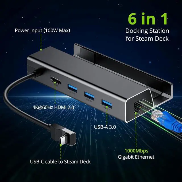6 in 1 Docking StationEquipped with HDMI 4K@60Hz output, Gigabit Ethernet input, 3 USB-A 3.0 ports, and 1 USB-C port for charging, Enhance your Steam Deck gaming experience. (Not compatible with protective cases with stands, please ensure that the thickness of the protective case is less than 2 mm. )