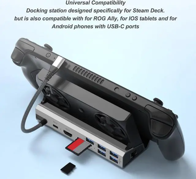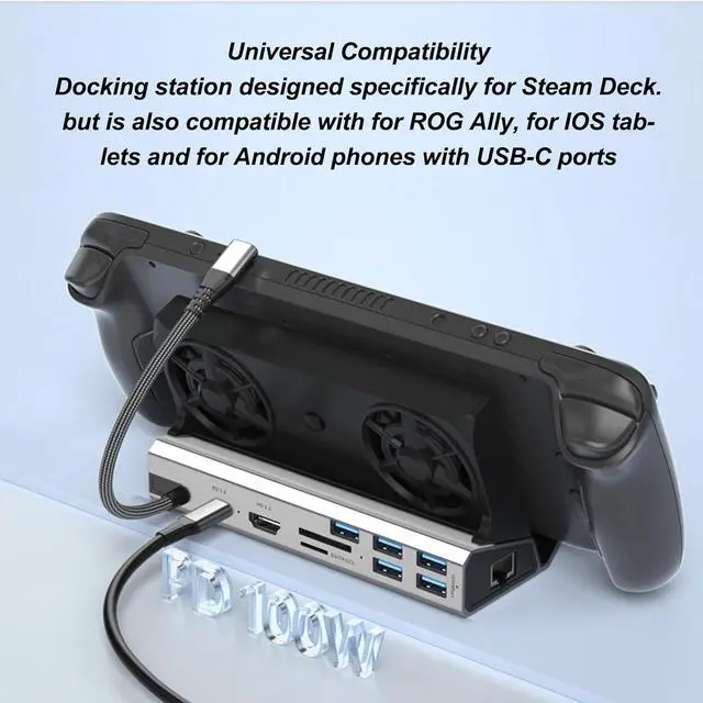 Universal Compatibility: Dual fan design supports fast physical fan heat. The docking station is designed for for Steam Deck, but is also compatible with for ROG Ally, for IOS tablets and for Android phones with USB C ports.