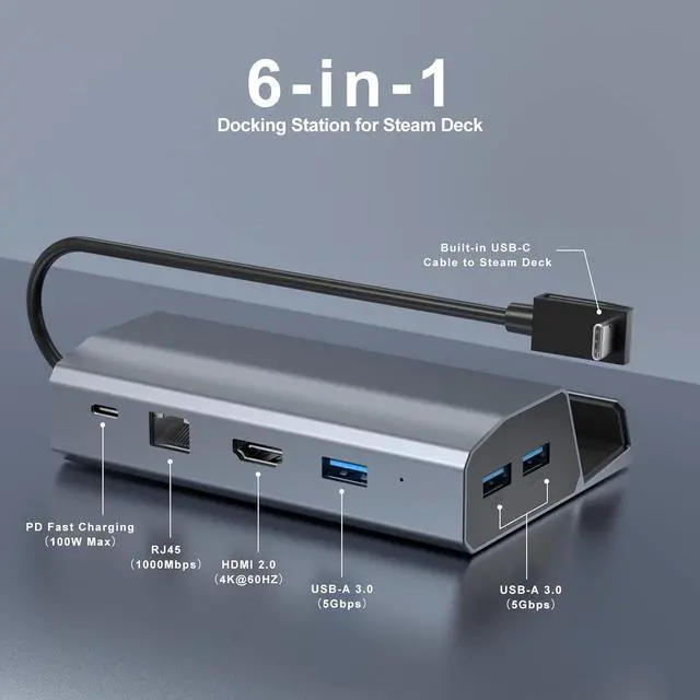 6-IN-1 Steam Deck Docking Station With HDMI 2.0 (4K@60Hz), Gigabit Ethernet (1000Mbps), 3*USB 3.0 ports (5Gbps), USB-C PD charging (100W), you can discover a new way to play with