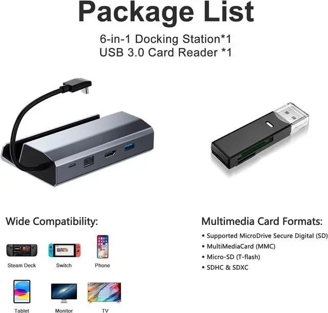 Wide CompatibilityThe docking station is designed for Steam Deck, but it is also compatible with iPads and Android phones with USB-C ports. (Package includes a Steam Deck docking station and a USB 3.0 card reader. )