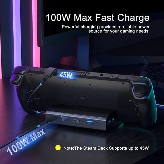 100W Input Power BEYIMEI Steam Deck Docking Station supports 100W Max Power Delivery, which can ensure your Steam Deck will not be out of battery. (NOTE: The MAX charging speed of Steam Deck is 45W. PD charging cable and charging head are not included).