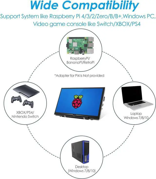 Multi Application Portable MonitorBroadly you can use it with your Raspberry Pi 4/3/2/1/3B+/BB, Banana Pi. Windows 7/8/10 PC, Microsoft, TV. Video game console like NS Switch/XBOX/PS4. Other devices or systems like Retro Pi, NOOBS, Debian, Ubuntu and Kodi are all supported.