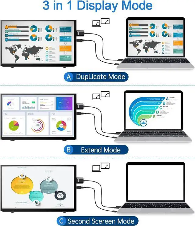 Three Application Modes for LaptopDuplicate mode, extend mode and second screen mode. Each mode has different use effects, bringing convenience and leisure to your work and life. Right click display settings on your laptop desktop, and then select three different usage modes in the multi display settings bar according to your needs. Go and get a laptop monitor now and feel a different experience.