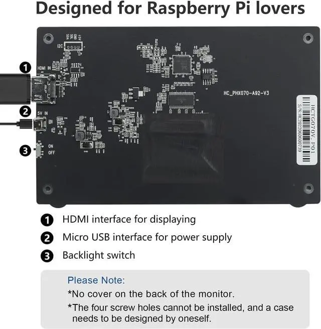 Raspberry Pi Screen MonitorHMTECH 7 inch raspberry pi monitor adopts tempered glass and full bonding process. It is equipped with IPS screen and 800 * 480 resolution, 178 ° viewing angle. The IPS panel color is accurate, showing more vivid color and contrast than VA and TN displays.