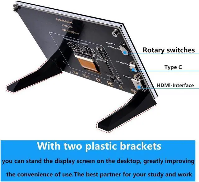 Package Includes --- 1x 7 inch LCD Screen (NON-Touch), 1x USB to USB-C Cable, 1x Full-Size HDMI Cable, 1x HDMI to Micro HDMI Adapter, 2x Stands