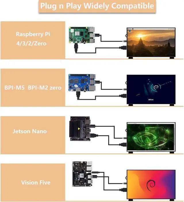 Multi-Purpose Usage --- In addition to being used as a portable screen for your SBC development board, it can also be used as a secondary monitor for your PC to expand your workspace. Additionally, it can be incorporated into DIY projects for added functionality.