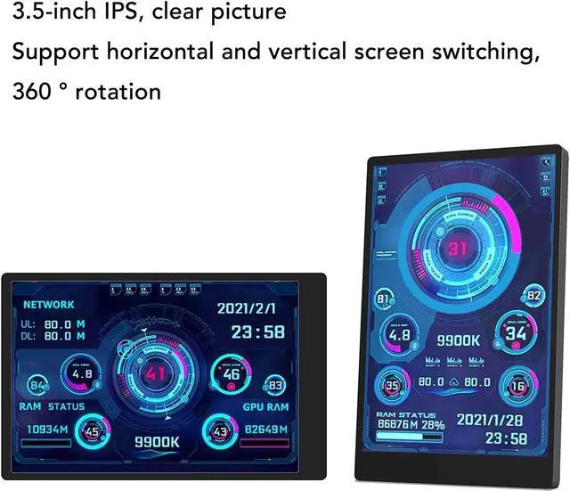 IPS: The picture is clear and can be placed inside the case or outside the case. Not only can display CPU, GPU, RAM usage and temperature, but also network speed, date, time, volume, weather forecast.