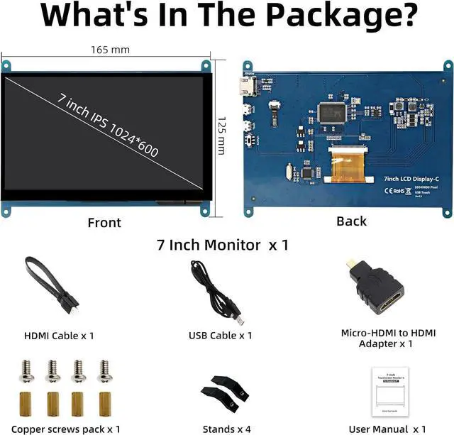 Package DetailsThe package includes a 7-inch Raspberry Pi screen, HDMI adapter, Micro USB cable, Micro-HD adapter, 2 stands, and 4 screws for easy installation. If you have any questions about the package, please feel free to contact us.