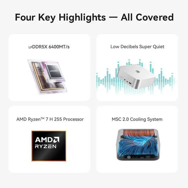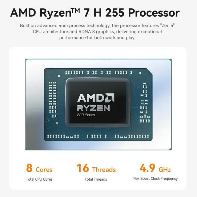 New Upgrade SER9 Mini PC- Beelink SER9 Mini PC is powered by AMD Ryzen 7 H 255 (TSMC 4nm FinFET, 8 cores/16 threads with 16MB smart cache support) with dynamic frequency up to 4.9GHz. together with the Zen 4 architecture and the AMD Radeon 780M Graphics Card (12 cores 2600MHz), it provides you with powerful graphics processing power for a faster and better visual experience when playing 3A games and loading graphics software.