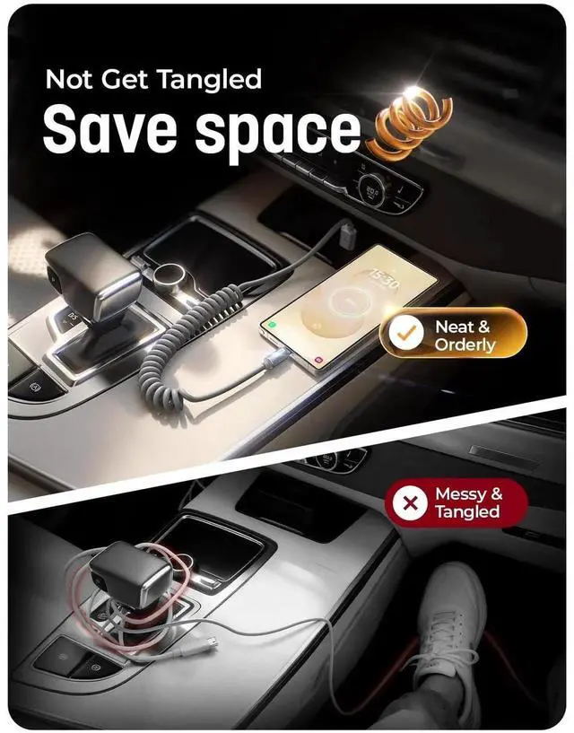 Neat & Safe Driving CompanionAre you tired of the messy cables in your car, and want to make your center console look neater? Carplay cable unique telescopic spring cable design avoids the drawbacks of ordinary straight cables, such as getting stuck on the gear lever or hanging near the accelerator/brake pedal that affect driving operations. Designed to be used with a cars USB port, it delivers a more focused and safe driving experience.