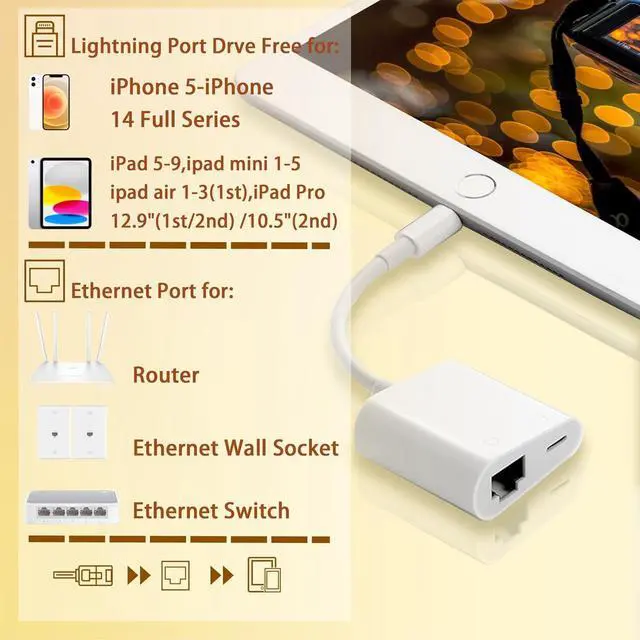 Wide CompatibilityOur lightning to ethernet adapter is compatible with iPhone 14/14 Plus/14 Pro/14 Pro Max/13/13 mini/13 Pro/13 Pro Max/12/12 mini/12 Pro/12 Pro Max/11/11 Pro/X/XS/XS Max/XR/8/8 Plus/7/7/7 Pro Max/XR/8/8 Plus/7/7/7 Pro Max/XR/8/8 Plus/7/7 Pro Max/XS/XS Max/XS Max. /XR/8/8 Plus/7/7 Plus / 6s/6s Plus/6/6 Plus/SE and iPad Air / Mini / Pro for iOS 10.3 and later (including the new iOS 17 or later).