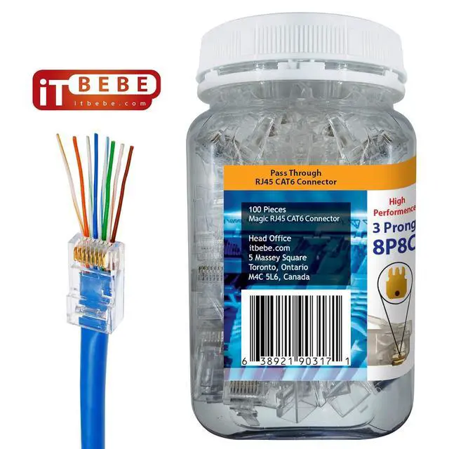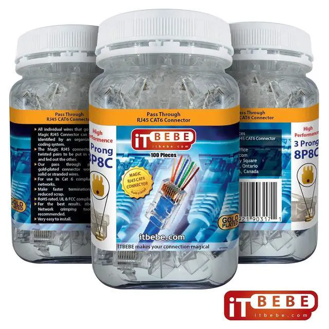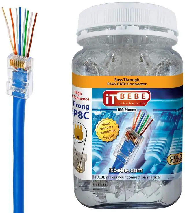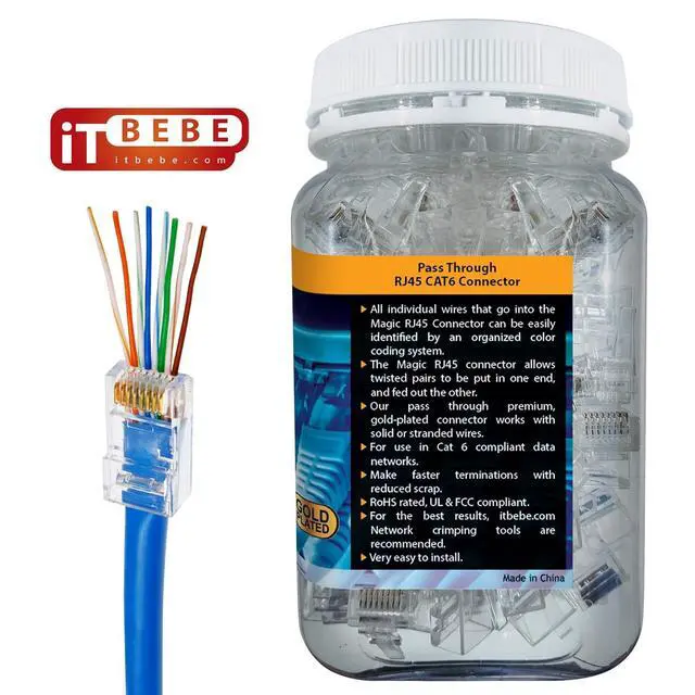 SINGLE-PIECE pass-through design speeds up terminations because wires are inserted through the connector in 1 simple motion. ITbebe Connectors are compatible with all RJ45 crimper tools and 24AWG cable.