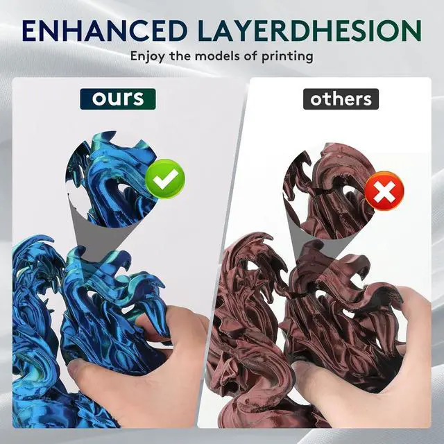 4. Strong Layer AdhesionThis silk PLA filament has perfect first layer adhesion to reduce warpage, shrinkage, curl and print failure. 1.75 mm Dual color silk 3D printer PLA Filament is no bubble, strong layer adhesion make the printing parts stronger.