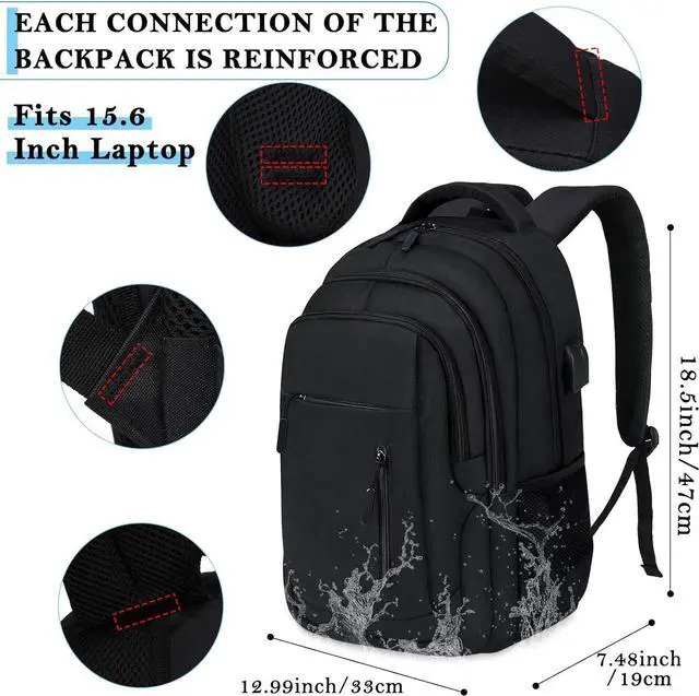 LARGE CAPACITY & LOTS OF COMPARTMENTSSize: 13x 7.5 x 18.5 (L*W*H). Computer laptop backpack owns 3 spacious main multi compartments. The separate laptop compartment fits up to 15.6 '' Laptop. Two spacious main compartment fits A4 folders, lunch, clothes, tablet and school supplies or travel accessories. 2 front zipper pockets for easy access essentials, mesh pockets at side for water bottle and compact umbrella.