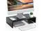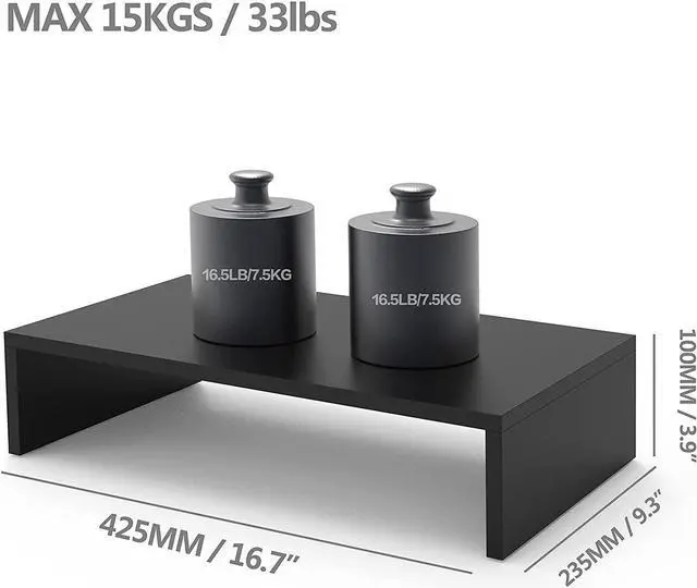 • Product Dimensions - 16.7(L) x 9.3(W) x 3.9(H) inches. Assembly needed. SLEEK, FASHIONABLE, ELEGANT DESIGN makes this monitor riser a very nice accessory for your desk and office. Make of durable black MDF. STABLE WON'T SLIDE, SHAKE, VIBRATE.