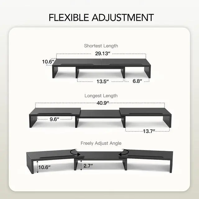 EASY TO ASSEMBLE: In just two minutes, you can get a dual monitor riser to make your work more comfortable and effective. Just use screws to assemble the base shelfs together and install the 2 side parts to the middle part