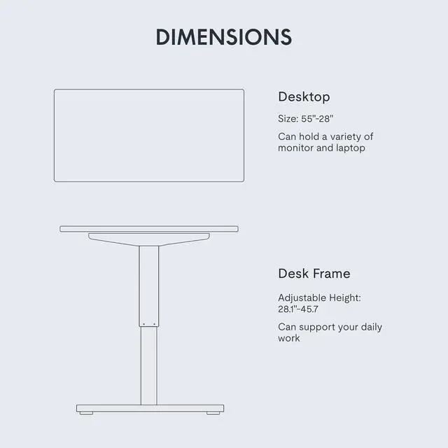 SMOOTH ELECTRIC HEIGHT ADJUSTMENT: Say goodbye to manual height adjustments. This desk is equipped with an electric lift system that allows you to easily adjust the desk's height from 28.1" to 45.7" (without 1" thickness of table top included). Even better, the motor operates quietly with noise levels below 50 dB, ensuring a peaceful working environment.