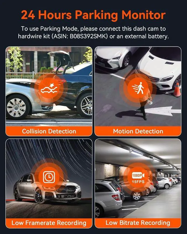 [ 24/7 Parking Monitor ] Buffered Motion Detection will auto start recording 5s in advance and keep recording for 30s when any movement is detected, which will help you perfectly store a complete video. Collision Detection will auto start recording and save the video file when your parked car is crashed. Low Bitrate and Low Framerate Recording Mode will help you save the storage space by reducing the image quality. Must be hardwired (