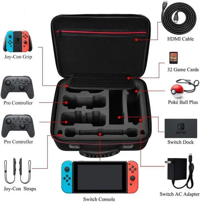 Maximum Capacity - Deluxe Carrying Case Fits for 2 pro controllers, 32 game cards and Switch (OLED) system (including dock, console, joy-con grip, power adapter and cables). The mesh pouch is roomy enough for storing HDMI cables and other accessories, and offers both protection and accessibility.