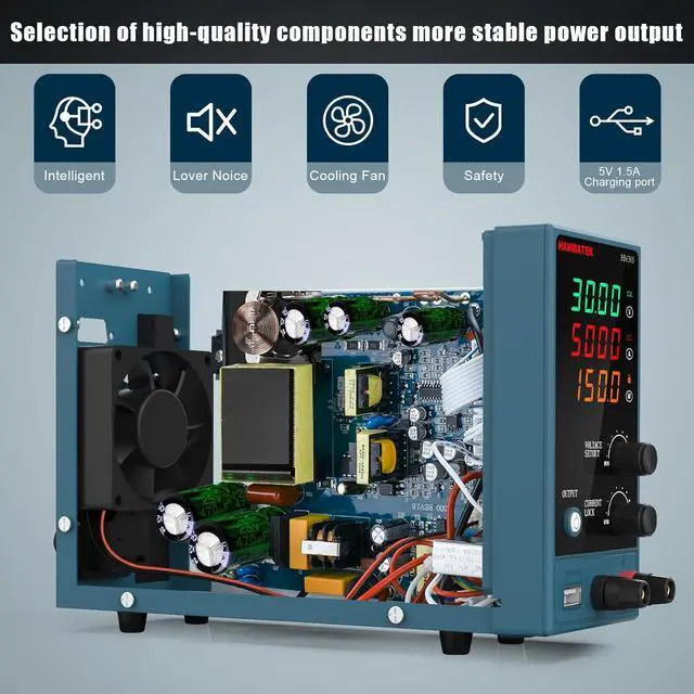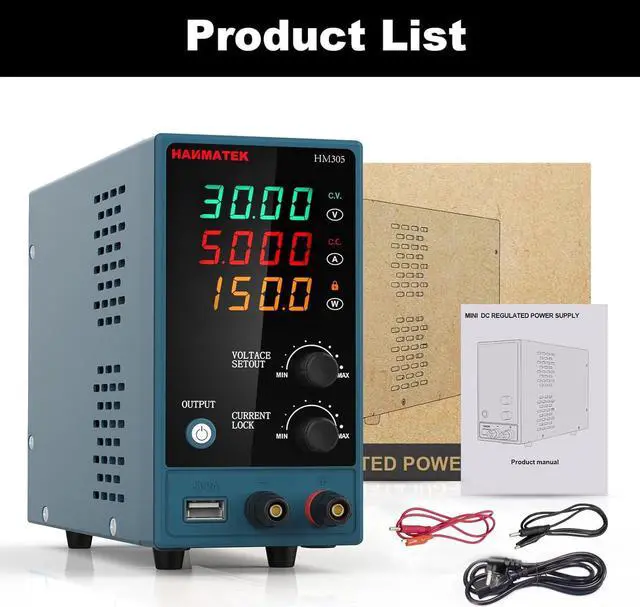 Package content 1 * HM305 DC Power Supply Variable, 1 * Output Power Cord, 1 * Input Power Cord, 1 * User Manual. Made of high-quality materials, the output is more stable, small size (80*150*230 mm), light weight ( 1.95KG ), easy to carry, move and easy to operate.