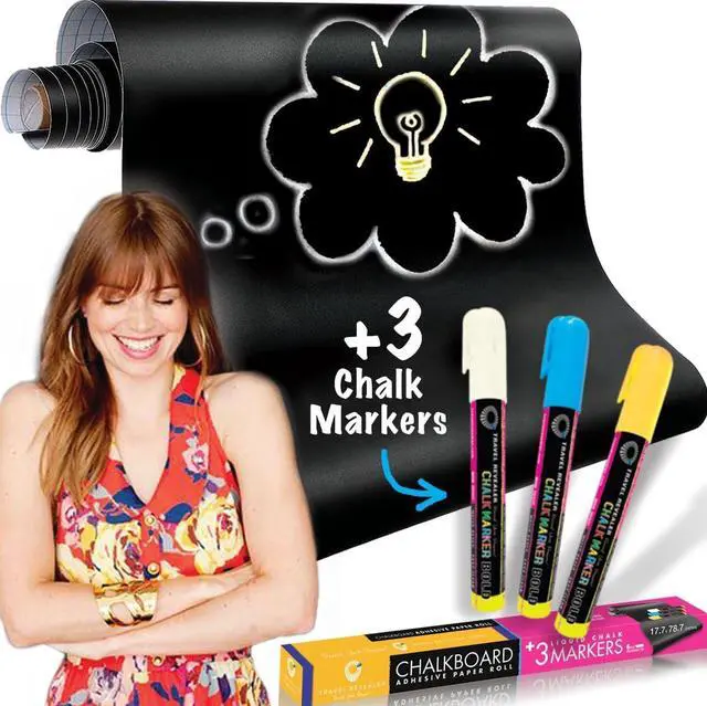 AT A GLANCE - Contact paper size: 17. 7 x 78. 7 inches. Three free markers included. Gift packaging. Chalkboard bulletin board paper or black kraft paper roll serves multiple uses