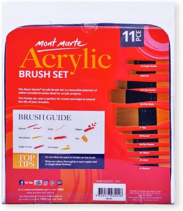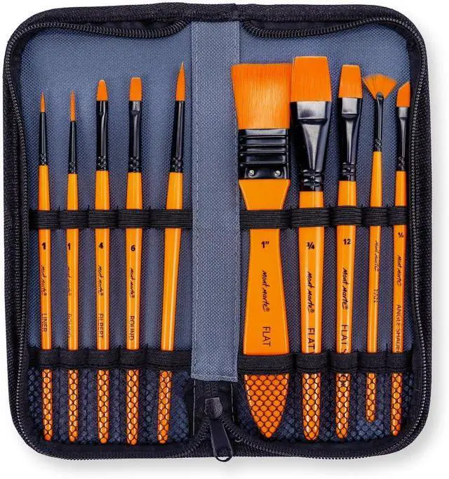 Includes 10 taklon paint brushes: Round #1, Liner #1, Filbert #4, Flat Shader #6, Round #6, Flat 1, Flat Wash 3/4, Flat Shader #12, Fan #2/0, Angle Shader #1/4
