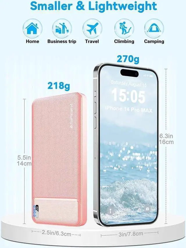 [Super Slim] Our compact and portable power bank is just the size of a mobile phone. At only 0.5 inches thick and weighing only 218 g, this external battery power bank can slide easily into your pocket or bag. It's lightweight and compact, making it essential for business, travel, hiking, and camping
