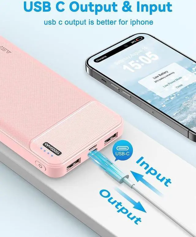[USB C Input & Output] Our upgraded portable battery charger has a USB C In & Out port that perfectly fits all your newer iPhones, iPads, and upcoming USB-C devices. It also has two USB-A output ports that recognize all connected devices and distribute load up to 5V 2.4A effectively. This USB C portable charger can work with not only all phones and tablets, but also smaller devices such as AirPods, Bluetooth headphones, fitness trackers, and smartwatches