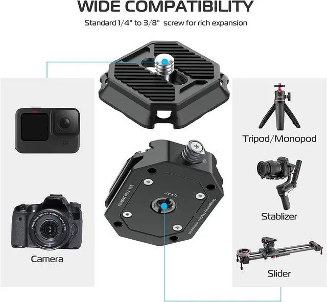 Wide Compatibility1/4" to 3/8" screw thread on base mount is compatible with tripod, stabilizers, gimbal, video monitor, monopod; 1/4" screw on top cap fits any cameras like sonny ZV-1, SLR, phone mount, Gopro adapter ect.