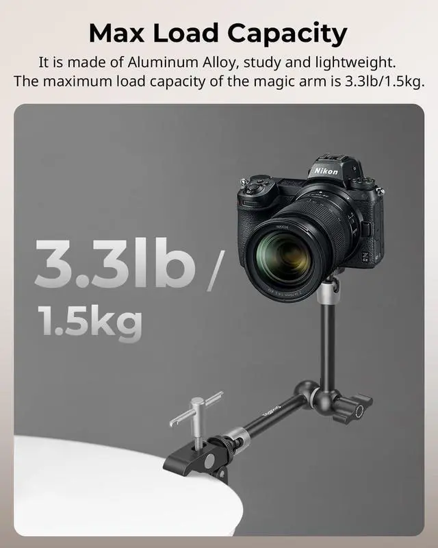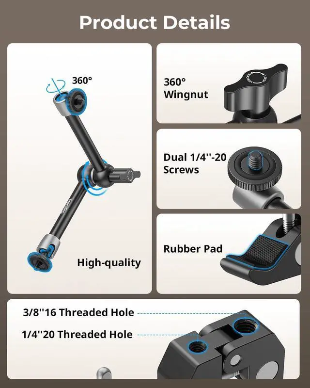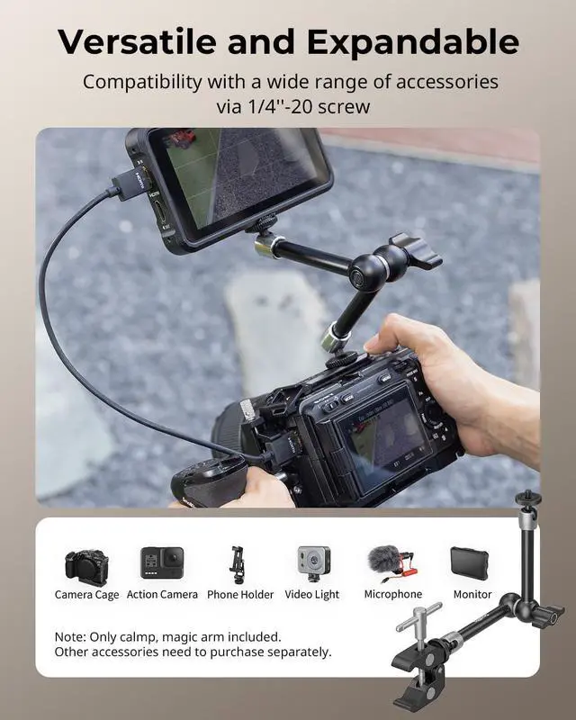 VERSATILITYSmallRig 2732 comes with a super clamp with 1/4" and 3/8" threads and an articulating arm with 1/4 screws on both ends respectively